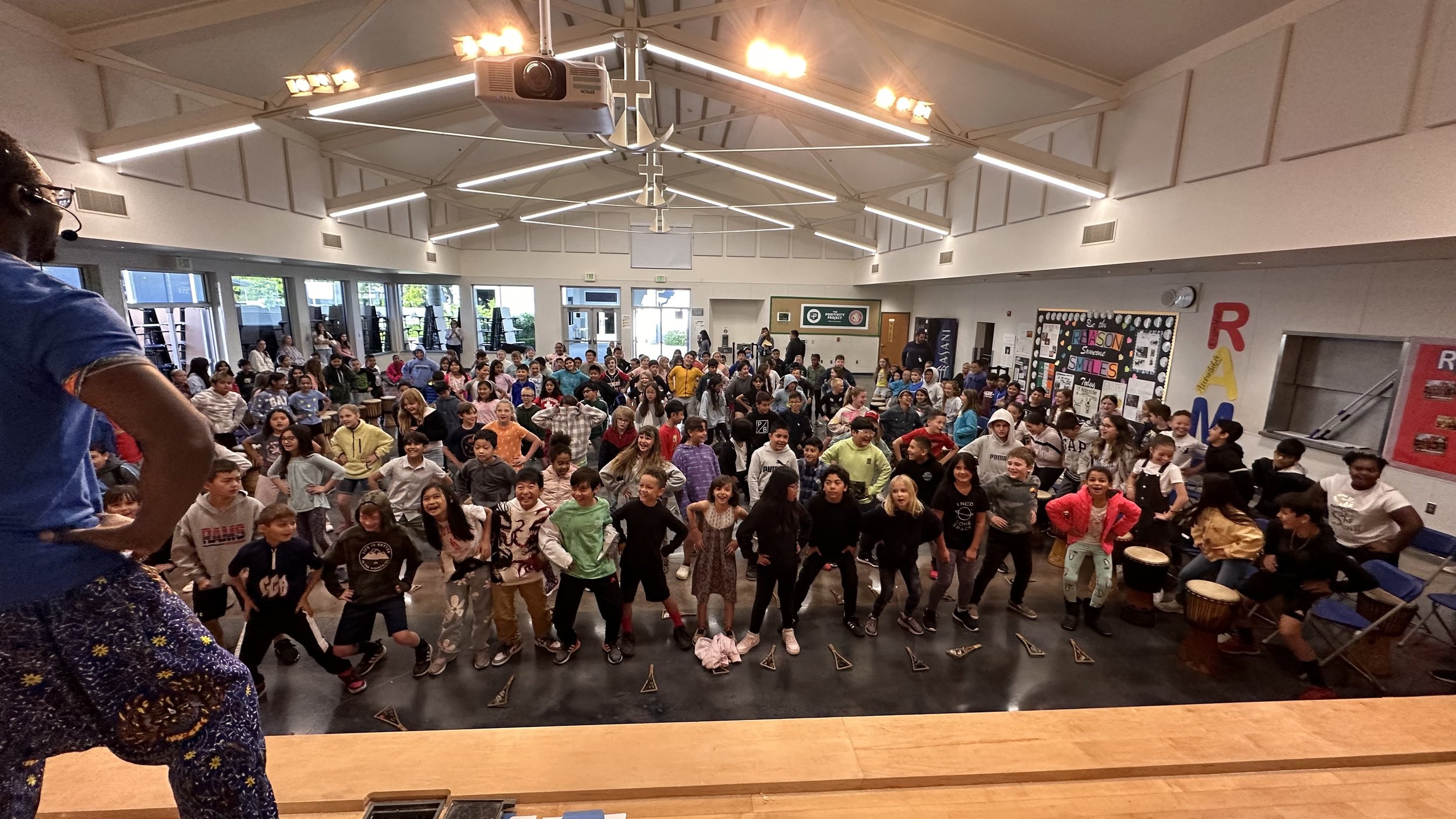 After staff introduction, Donte and Shar will start their 45 minute school assembly set, playing advanced traditional drumming arrangements for the audience. They also teach singing, dancing, call on volunteers, and often bring instruments for students to play on stage.